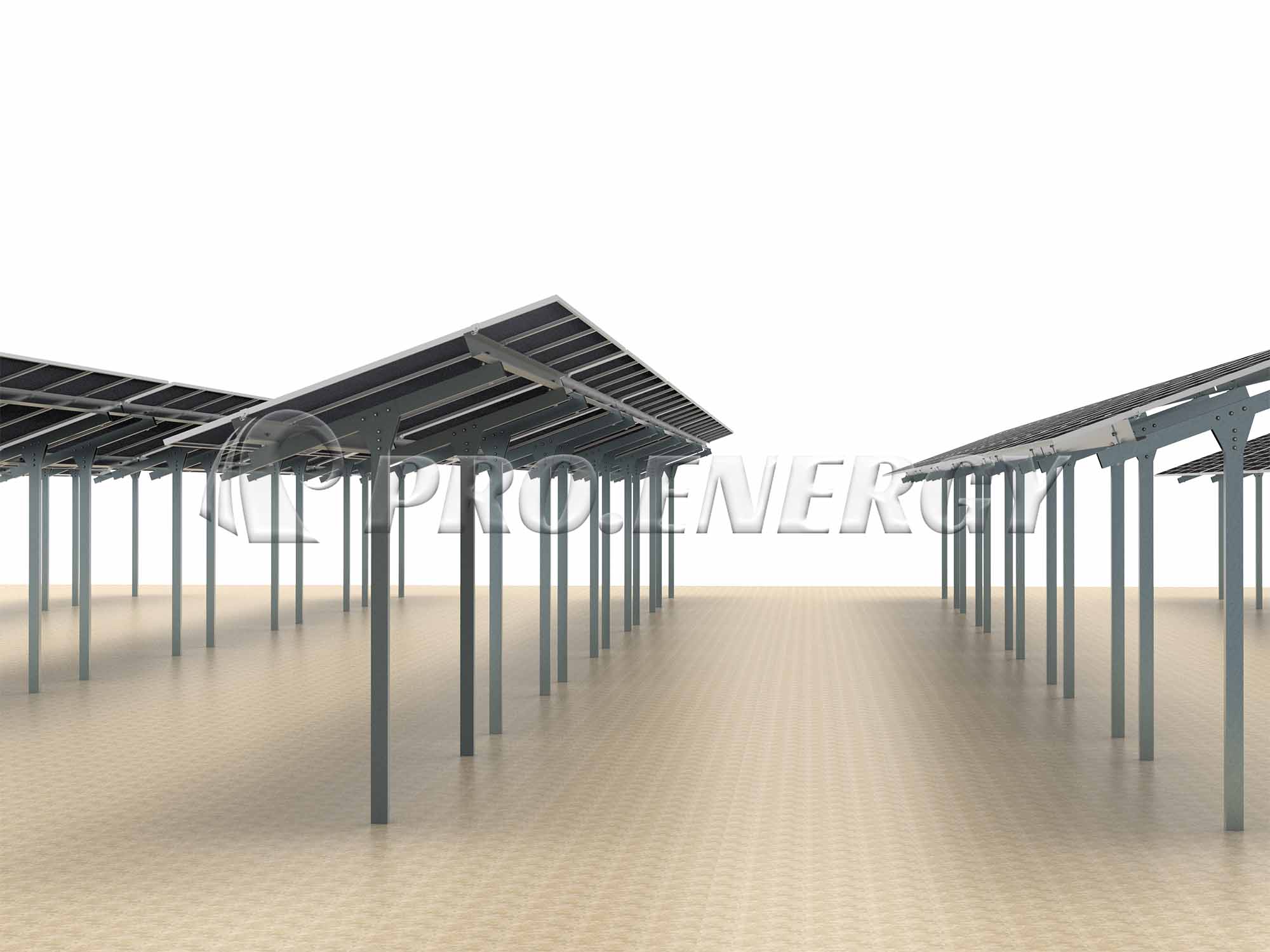 PROFENCE.ENERGY 设计的这款创新型单柱式太阳能发电系统,可在架设的太阳能电池板下方同时种植小麦、玉米、向日葵和其他作物。其简化的结构确保了安装和维护的便捷性。电池板行间宽敞,农用机械可以自由作业,从而实现高效的土地耕作。该系统尤其适用于小麦等喜阳作物,因为它在提供最佳光照条件的同时,还能产生清洁能源。