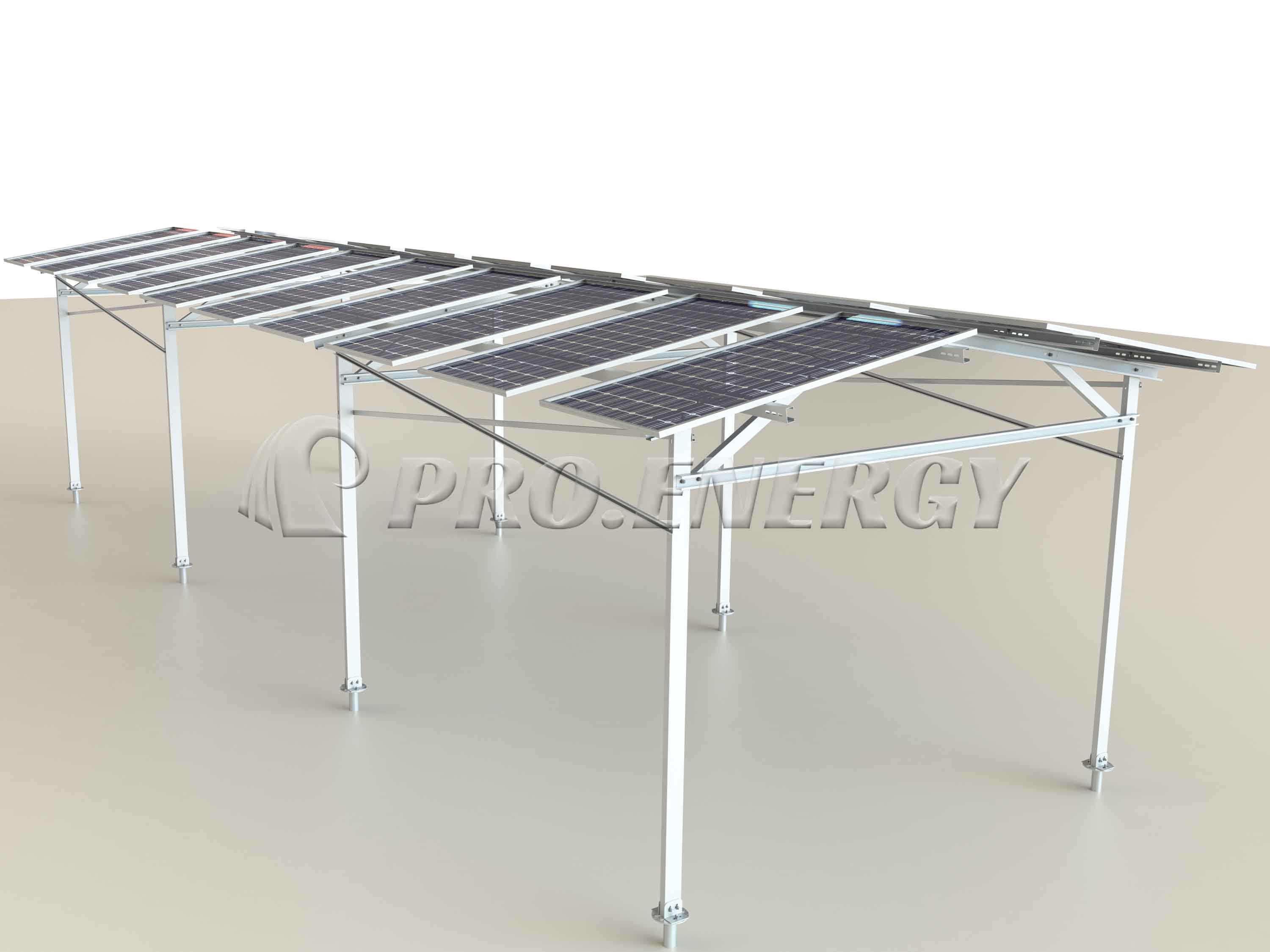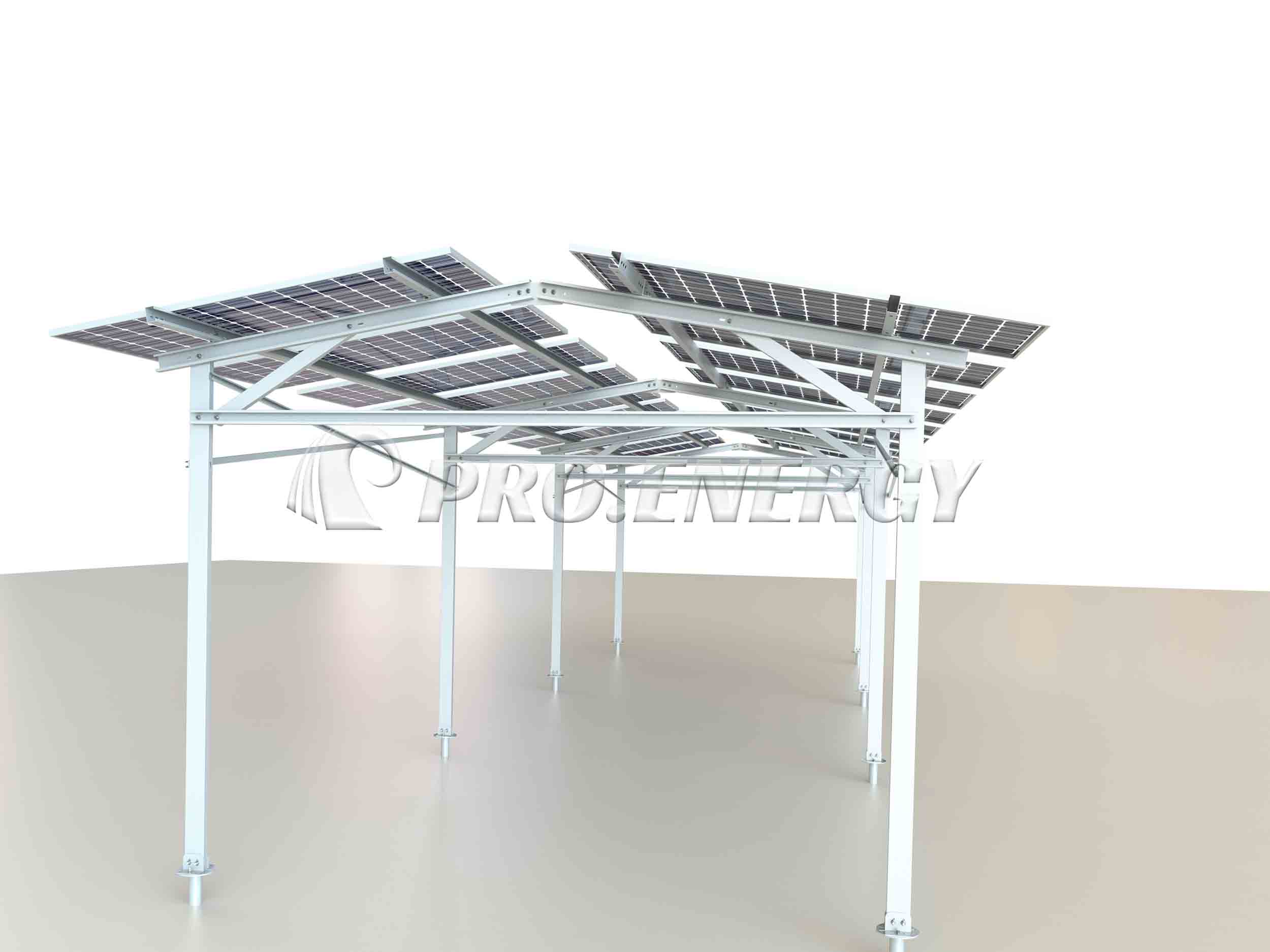 该系统是一种架空式太阳能发电结构,专为农业和畜牧业双重用途而设计,例如作物种植和牲畜圈养。其朝西的面板布局可最大限度地提高能量捕获效率。面板下方的三角形空间为逆变器安装提供了合适的区域。该结构还能有效防止雨天积水。该系统采用螺旋桩基础,确保快速安装,并将对地面的扰动降至最低。